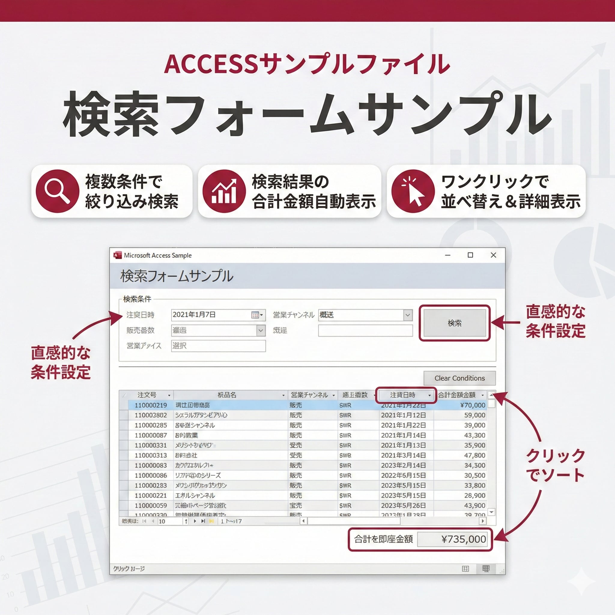 ・受注日、売上日、販売チャネルなどの複数の検索条件を組み合わせて検索できる
